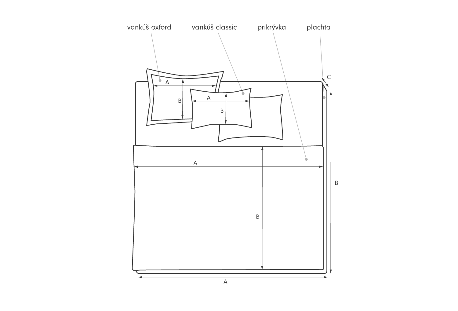 Obliečka na vankúš môže mať hladký okraj alebo ozdobnú kantu. Rozmer povlaku je vždy udaný ako rozmer od švu k švu, pričom otvor pre výplň je na strane B. Obliečka periny má otvor aj na strane A. Pri meraní pre objednávku prestieradla sa zamerajte štandardne na šírku(A) a hĺbku(B), ale aj na výšku matraca(C). Naše prestieradlá sú univerzálne šité pre matrace výšky 18-30cm.